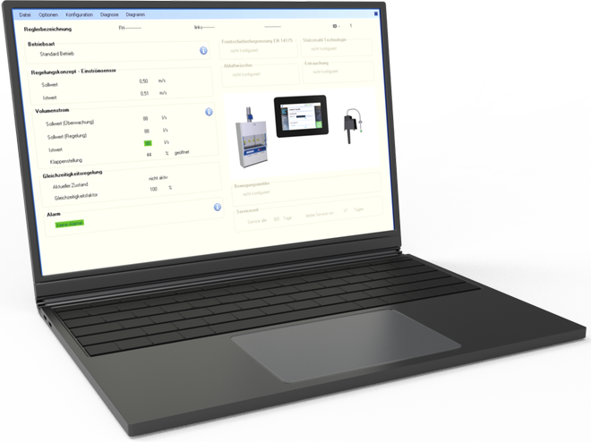 Der Laborabzugsregler überwacht den Volumenstrom und gegebenenfalls zusätzlich die Einströmgeschwindigkeit. Eine relevante Abweichung wird von der 3-farbigen Funktionsanzeige übermittelt. Ein zu niedriger Volumenstrom führt zusätzlich zu einer akustischen Alarmierung.