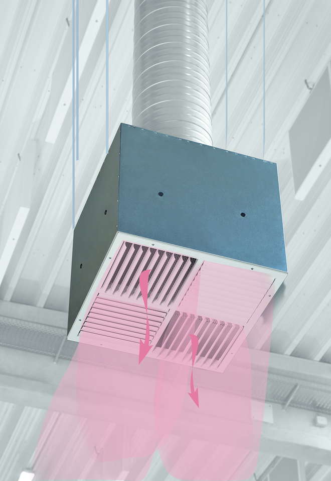 Deckendralldurchlässe mit quadratischem Frontdurchlass für Komfort- und Industriebereiche mit großen Raumhöhen. Als Zuluftdurchlass. Lamellen der diagonal gegenüberliegenden Lamellenfelder verstellbar für horizontale bis vertikale Luftführung. Horizontale Luftführung mit hoher Induktion. Zum freihängenden Einbau oder für abgehängte Decken aller Art.