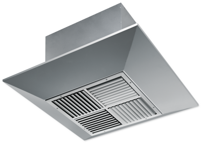 Deckendralldurchlässe mit quadratischem Frontdurchlass für Komfort- und Industriebereiche mit großen Raumhöhen. Als Zuluftdurchlass. Lamellen der diagonal gegenüberliegenden Lamellenfelder verstellbar für horizontale bis vertikale Luftführung. Horizontale Luftführung mit hoher Induktion. Zum freihängenden Einbau oder für abgehängte Decken aller Art.