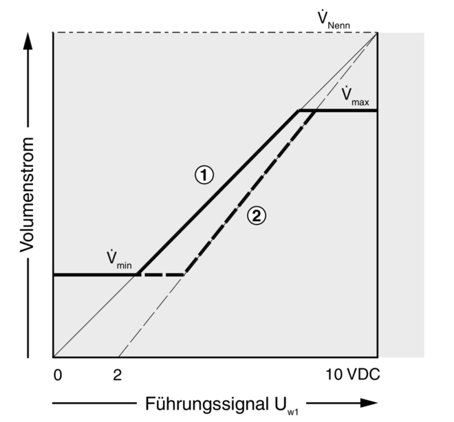 Der Volumenstrom-Sollwert wird von einem übergeordneten Regler (z. B. Raumtemperaturregler, Luftqualitätsregler, Gebäudeleittechnik) als Spannungssignal oder Datenpunkt oder lokal durch Schaltkontakte vorgegeben. Die variable Volumenstromregelung erfolgt zwischen Vmin und Vmax. Die Übersteuerung der Raumtemperaturregelung durch Zwangsschaltungen, beispielsweise Absperrung, ist möglich.