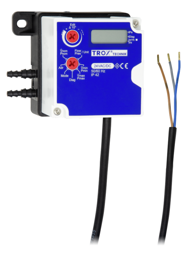 Die Volumenstrommessung erfolgt durch Messung eines Wirkdrucks. Dafür enthält die Volumenstrom-Messeinrichtung einen Wirkdrucksensor. Der Wirkdruck wird von einem Wirkdrucktransmitter mit statischem Messprinzip in ein Spannungssignal umgewandelt. Der Volumenstrom-Istwert steht als Spannungssignal zur Verfügung. Durch die werkseitige Justage entsprechen 10 V DC immer dem Nennvolumenstrom (qvnenn). Spannungsbereiche sind im Transmitter gespeichert.
